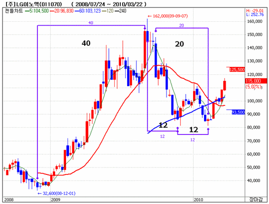 LG이노텍의 주봉차트를 본다면, “40주 상승과 20주 조정을 보이는 전형적인 탄생파동 조건을 갖추고 있으며,12주 하락과 12주 쌍바닥을 보인 이후 급등하는 양상을 보이고 있다”라고 분석했다.