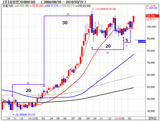 삼성전기의 주봉차트를 본다면, ‘고점에서 20주 조정을 보인이후,새로운 상승을 시도하면서 쌍봉의 고점을 돌파하는 3번째 상승시도다”라면서 이번 상승 시도로 전고점을 돌파할 가능성이 많다고 분석했다.