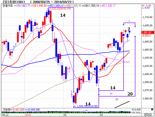 거래소 일봉차트를 본다면,”저점에서 14수 주기를 보였기 때문에,14수 동안 상승했으며,지금은 등락을 보이는 혼조세다”라면서 “1685를 강하게 돌파하는 흐름이 나온다면 1720까지 순항하겠지만,그렇지 않는다면 가격조정이 아닌 기간조정으로 일일 등락이 거듭되는 횡보국면이 지속되다 20일 전후로 재차 상승파동이 전개된다”라고 분석했디.