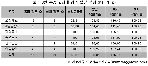 24일 상가정보업체 상가뉴스레이다에 따르면 지난 22일~23일 이뤄진 전국 신규 LH 단지내 상가 입찰 결과 총 47개 점포 중 28개 점포가 낙찰돼, 약 59.6%의 낙찰공급율을 기록한 것으로 나타났다.