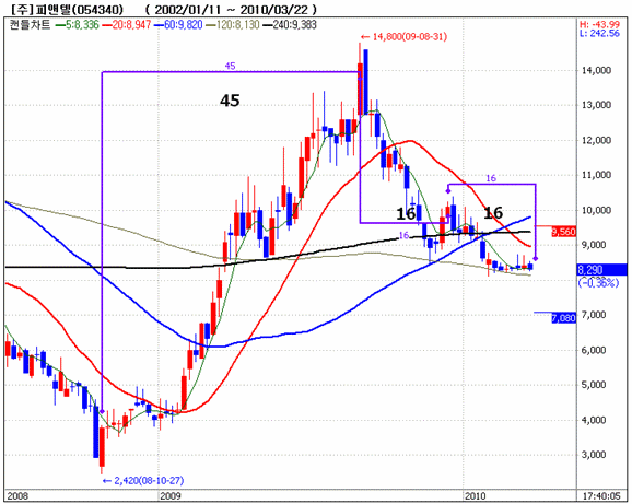 기술적 분석으로 본다면, “상승 주기가 90주의 1/2인 45주이며.조정파동이 16주의 역n 자형 이중바닥을 보였다”라면서 “손절선인 8000원이 깨지지 않는 한 상승세는 살아있다”라고 분석했다.