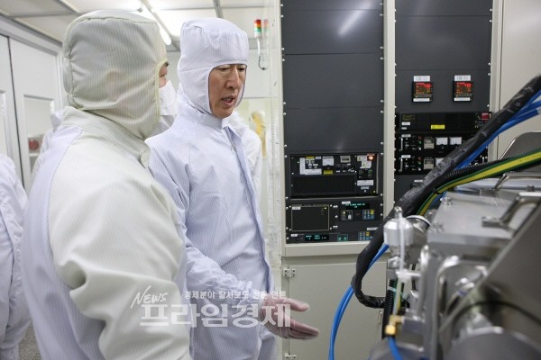 | ▲ GS 허창수 회장(오른쪽)이 GS칼텍스 신에너지연구센터 내 GS나노텍 클린룸에서 남상철 대표(왼쪽)로부터 박막전지 생산설비에 대한 설명을 듣고 있다. |