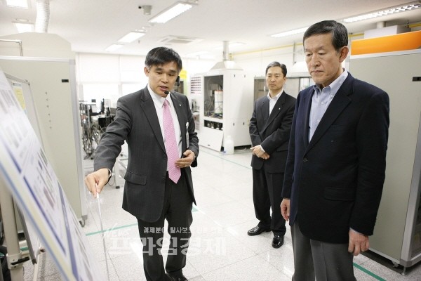 | ▲ GS 허창수 회장(오른쪽)이 GS칼텍스 신에너지연구센터 내 GS퓨얼셀 연구실에서 배준강 대표(왼쪽)로부터 연구시설 및 공정에 관한 설명을 듣고 있다. |