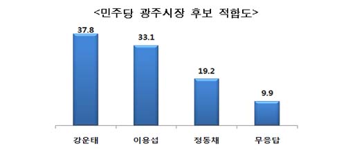 여론조사 전문기관인 한국공공데이터센터(KPDC)가 광주시민 대상으로 민주당 광주시장 후보적합도를 조사한 결과, 강운태 의원이 37.8%를 얻어 이용섭 의원 33.1%, 정동채 전 문화관광부장관 19.2%를 앞섰다. 무응답과 지지후보 없음 응답은 10.8%로 나타났다.