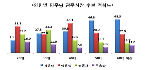 강운태 의원은 50대(46.8%), 60대 이상(48.3%)에서 응답자의 지지를 얻는 것으로 조사됐다.