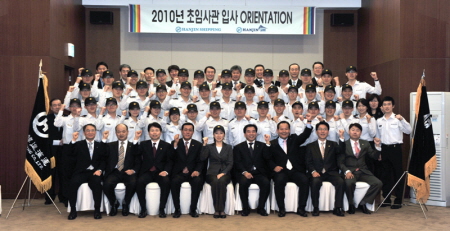 <사진설명= 한진해운은 26일 최은영 회장이 직접 참석한 가운데 치열한 경쟁을 뚫고 선발된 2010년 초임 해기사 1차 교육 합숙 인원 41명에 대한 사령장 수여식을 개최했다.> |
