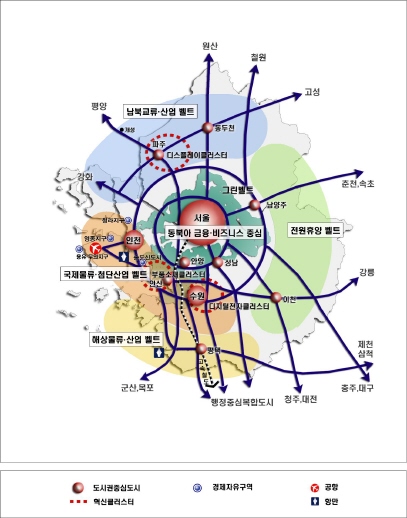 서울 중심의 수도권이 통근권과 생활권, 역사성 등을 고려한 10개 내외의 자립적 도시권을 중심의 다핵연계형 공간구조로 개편된다. 지역간 연계를 강화해 서울의 부담을 경감시키고 수도권의 균형발전을 이끌기 위함이다.