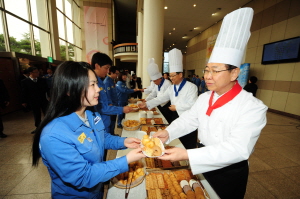 <사진설명= 포스코 정준양 회장이 31일 포항 효자아트홀에서 임직원, 패밀리사, 외주파트너사 관계자 등 600여명이 참석한 가운데 열린 창립42주년 기념식에 앞서 쉐프 복장을 하고 참석자들에게 쿠키를 나눠주고 있다.> |