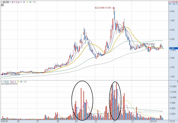 거래량이 없던 종목이 거래량이 점진적으로 늘어나면서 이평선을 타고 완만하게 상승하는 시점은 선도세력이 주가를 잘 관리하면서 상승하는 시점입니다. 하지만 모든 종목이 끝없이 올라가는 것이 아닌 것처럼 언젠가는 저가에서 매수한 세력이 매도를 할 것입니다. 그 시점이 바로 대량거래가 일어나는 시점입니다.
