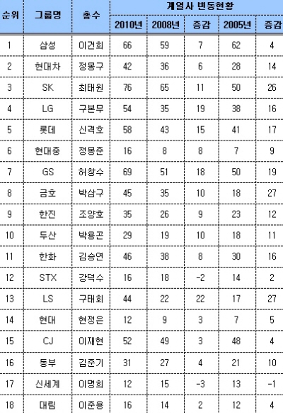 삼성 역시 같은 기간 계열사가 62개사에서 59개사로 3개사가 줄었지만 2008년 이후 7개사가 새로 설립, 이명박 정부 출범 이후 계열사가 부쩍 많아졌다.