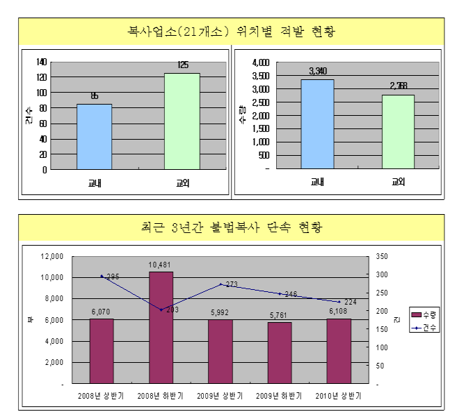 이번 단속 대상 2,200여개 업소 중 210개 업소가 불법복사를 하다 적발되었으며, 적발 업소의 40%인 85개 업소가 대학교 내에 위치하고 있었다. 적발수량도 전체의 55%인 3,340점이 교내 복사업소에 의해 자행되었다.