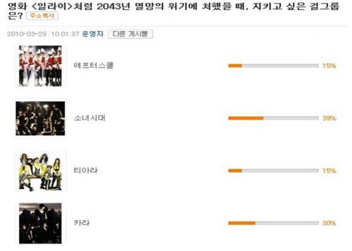 <영화 '일라이' 진행한 이색 설문에서 소녀시대가 '멸망의 위기에 처했을때 지키고 싶은 걸그룹' 1위를 차지했다. / 출처=네이트> |