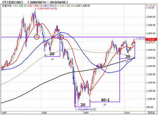 기술적 분석으로 본다면 “1700이라는 지수는 2000돌파시에 강력한 상승이 일어난 시기이자, 본격적인 하락장세가 시작되는 추세이탈의 변곡점이다”라면서 “3년이 지난 시기에 반등이 이어지기 때문에 매물대가 안정화되는 양상이 나타나고 있으며, 기술적 분석으로 1750이 돌파되면 실질적인 매물대를 뚫었다”라고 분석했다.