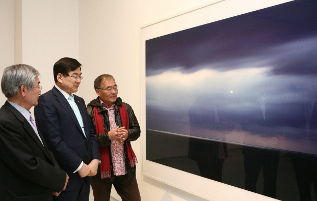 이 날 개관 기념전시회로는 배병우 사진전이 열렸다.  사진은 조양호 한진그룹 회장(가운데)이 배병우 작가(오른쪽)로부터 작품 설명을 듣고 있는 모습이다.