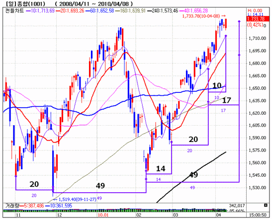 [프라임경제] 임상현(필명:세림) 애널리스트는 “2분기인 4~6월의 실적장세 조짐을 알 수 있는 시그날은 거래소 지수 1733포인트 돌파와 함께 진행된다”는 견해를 기술적 분석과 함께 논리적 근거를 제시했다.