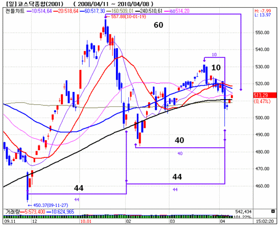 코스닥 일봉을 기술적 분석으로 본다면, “1월 고점에서 3개월 동안 기간조정이 진행되는 과정이 끝나가고 있다”라면서 “저점에서 본다면,44수 주기의 2수배인 점에서 마지막 저점이 완성된다”라고 말했다.