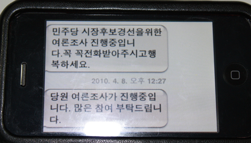 한편 이번에 벌어진 불법 여론조사는 ‘민주당 시장후보 선출 여론조사가 진행 중입니다. 꼭 꼭 전화를 받아주시고 행복하세요’ 라는 문자를 먼저 발송한 뒤 이뤄졌다.