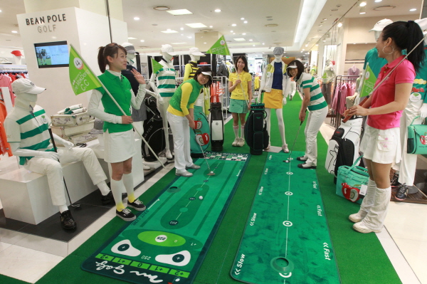 임시로 마련된 필드 곳곳에 퍼팅기,골프공, 골프채를 준비해 골프복을 구매하러 온 고객들이 간단한 골프게임을 즐길 수 있도록했다. 3일간 판매사원들도 골퍼,캐디 등을 연상하는 복장으로 통일해 골프장 분위기를 극대화한다.