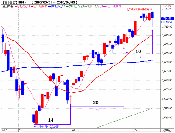 거래소 일봉을 기술적 분석으로 본다면 “20일선 안착이 이루어진 1580이후 20일 거래일만에 100포인트 상승한 1680포인트 안착이 이루어졌다”라면서 “1680이후 다시 10일만에 50포인트 상승한 1730을 기록했으며,이후 급격한 조정이 이루어진 상황이다 ”라면서 단기 급락이후 새로운 상승세를 보일 것이라고 분석했다.