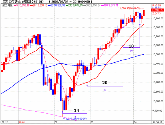 다우존스 일봉을 기술적 분석으로 본다면 “20일선 안착이후 20일 동안 상승했으며,이후 10일 동안 횡보의 움직임을 보이고 있다”라면서 “10일만에 횡보를 마치고 새로운 상승세를 보였다”라고 분석했다.