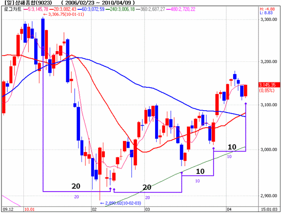상해종합지수 일봉차트를 기술적 분석한다면 “20일 주기 하락과 20일 주기 횡보를 마치고 새로운 상승세를 시도하고 있다”라면서 “새로운 상승 시도가 10일 주기로 분할되면서 상승파동이 전개되고 있다”라고 분석했다.