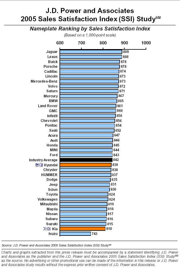 다음은 JD파워 앤드 어소시에이츠 발표 판매만족도 순위 및 발표문이다.