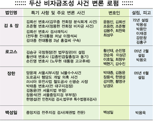 박용오 두산명예회장, 박용성 전 그룹회장과 박용만 전 그룹부회장, 박용욱 이생그룹 회장 총수 일가 등 피고인수가 모두 14명인 점을 감안할 때 변호인은 1명당 2명꼴이다. 이번 사건을 수사한 검사의 선배들인 서울중앙지검 금융조사부 출신변호사도 상당수 포진했다.