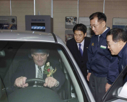 | 29일 기아차 화성공장에서 정의선 사장과 조남홍 화성공장(맨 오른쪽)의 안내로 얀 슬로타(Jan Slota) 질리나 시장이 신차 로체(은색)에 탑승해 보고 있다 | ||