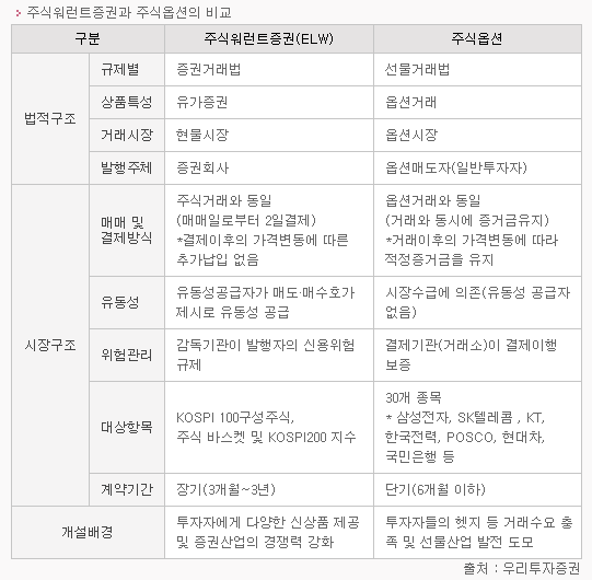 주식워런트증권은 그 상품 특성이 주식옵션과 유사하지만 법적인 구조, 시장구조, 발행주체와 발행조건 등에 차이가 있다.