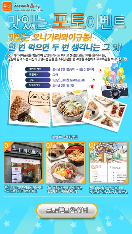 포토 이벤트 참가자 중 추첨을 통해 총 20명을 선발하여, 오니기리와이규동 5천원 무료 쿠폰 2매를 증정할 계획이다.