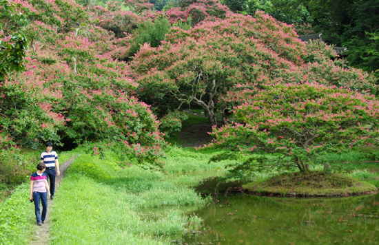 명옥헌과 연못을 둘러싸고 흐드러지게 핀 연분홍 배롱나무꽃이 연못에 반영된 배롱나무 꽃과 조화를 이루며 늦여름의 정취를 더한다.