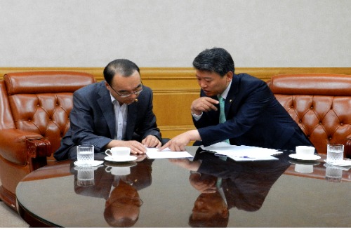 | 민노당 김선동 의원이 최근 박재완 기획재정부 장관을 면담해 2013순천만정원박람회 국비 필요성을 설명하고 있다. 사진은 김선동 제공. | ||
