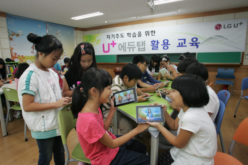 사진은 LGU+가 강원도 횡성군 소재의 서원초등학교 3~6학년 학생들을 대상으로 ‘자기주도 학습을 위한 에듀탭 활용 교육’을 진행하고 있는 모습.