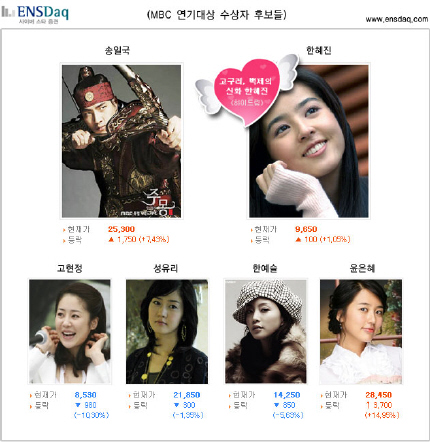 스타의 활동상과 팬들의 인기도에 따라 사이버 주식을 사고 팔면서 스타의 주가가 결정되는 사이버 스타 증권 엔스닥에서는 각 방송사의 년말 시상식 수상 실적에 따라 배당을 실시하고 있어 MBC 연기대상 수상 후보가 발표됨에 따라 이들 후보에 대한 대박 배당의 기대감으로 수상 후보들의 주가가 연일 가파른 상승세를 보이고 있다.