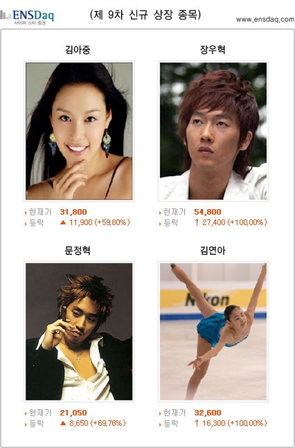 스포츠 종목에서는 ‘피겨여왕’ 김연아 선수가 16,300원으로 상장되어 현재 100%오른 상한가 32,600원을 기록 하고 있어 새로운 ‘국민 여동생’의 탄생을 예고 하고 있다. 또한 연기자로 변신한 그룹 신화 출신의 에릭은 본명 문정혁으로 연기자 부문으로 상장에 성공하여 12,400원에 상장되어 역시 상한가를 이어가고 있어 단숨에 연기자 부문 6위에 올라 ‘주몽’의 송일국(26,000원)을 위협하고 있어 향후 연기자 종목의 블루칩을 예고 하고 있다.
