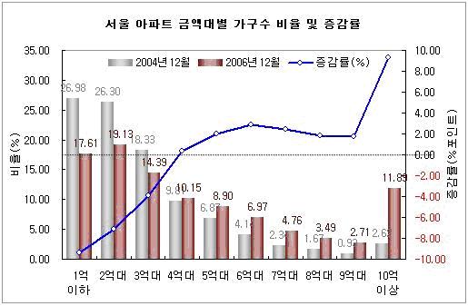 10억 원을 넘는 초고가 아파트 비율의 증가세는 더욱 두드러진 것으로 나타났다. 2004년 당시 2.62%에 불과했으나 2년이 지난 현재 11.89%로 5배 이상 증가했다. 이는 10가구 중 1가구 꼴로, 10억 원이 넘는 아파트가 흔해진 것이다.