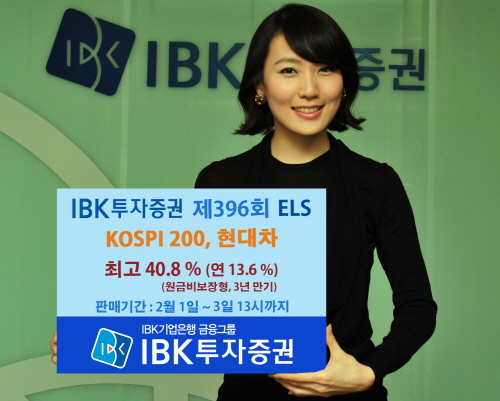 'IBK투자증권 제396회 ELS'는 KOSPI200지수와 현대차 보통주를 기초자산으로 하는 원금비보장형 상품으로 3년 만기에 최고 40.8%(연 13.6%) 수익을 지급한다.