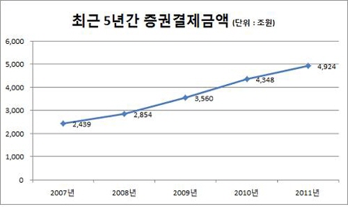 31일 한국예탁결제원(예탁원)에 따르면 2011년 예탁원을 통해 이뤄진 증권결제대금 연간 총액은 4924조원(일평균 20조원)으로 전년 4348조원 대비 13.2% 증가했다.