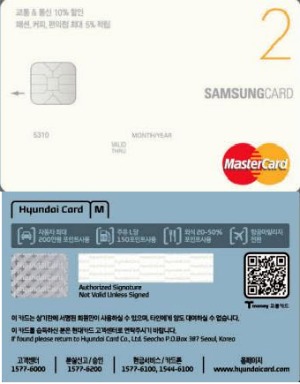 | 현대카드(아래)는 최근 카드 뒷면의 마크네틱 라인을 숨기고 대신 해당 카드의 핵심 서비스를 넣은 디자인을 선보였다. 삼성카드(위)의 숫자카드 또한 카드 앞면에 해당카드의 대표 혜택을 적어 고객 편의를 고려했다. | ||