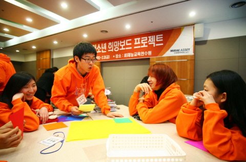 | 미래에셋박현주재단이 주최한 '제2회 청소년 희망보드 프로젝트'에서 참가학생들이 비전의 의미와 필요성에 대해 토론하고 있다. (사진-미래에셋 제공) | ||