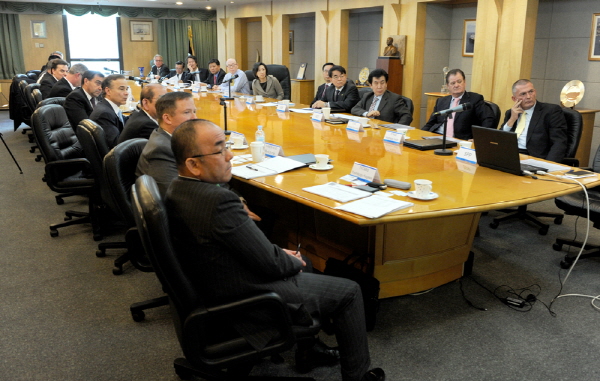 [프라임경제] 한진해운그룹이 3일 서울 여의도 본사에서 최은영 회장 주재로 현지인 매니저를 대상으로 해 2012년 2차 ‘스마트 매니지먼트(Smart Management)’ 회의를 개최했다. 사진은 최은영 회장과 본사 임원 및 현지인 매니저가 2012년 경영전략을 듣고 있는 모습.