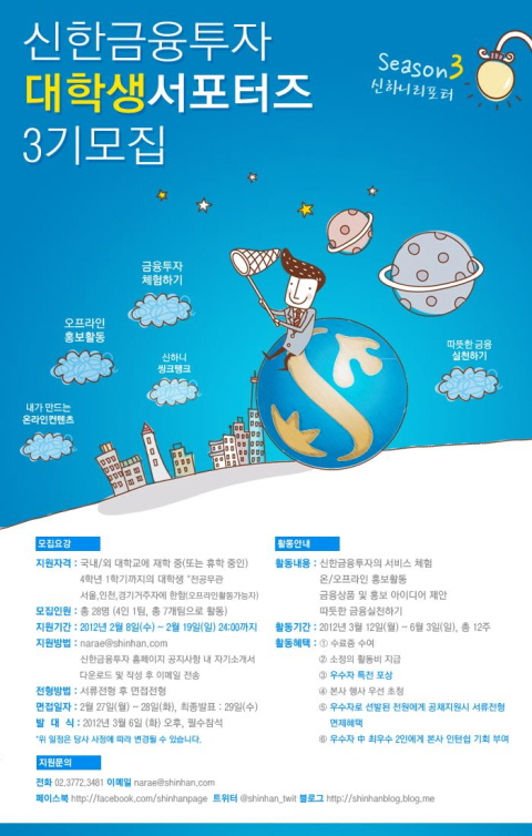 서포터즈 참여는 신한금융투자 홈페이지 또는 블로그에서 신청서를 다운로드 받아 접수하면 된다. 서류전형과 면접을 통과한 합격자를 대상으로 3월6일 발대식이 개최된다.