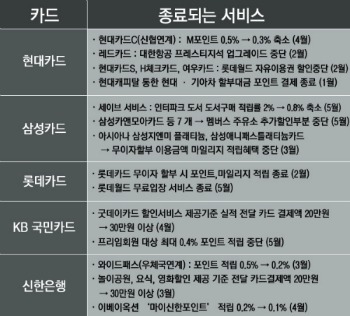 포인트적립 관련 서비스도 줄어든다. 현대카드는 4월부터 신협과 연계해 발급하고 있는 현대카드C의 M포인트를 기존 0.5%에서 0.3%로 축소한다. 또한 현대캐피탈을 통해 현대ㆍ기아차 구입 후 할부대금을 포인트로 결제할 수 있었던 서비스도 지난 달 종료됐다.
