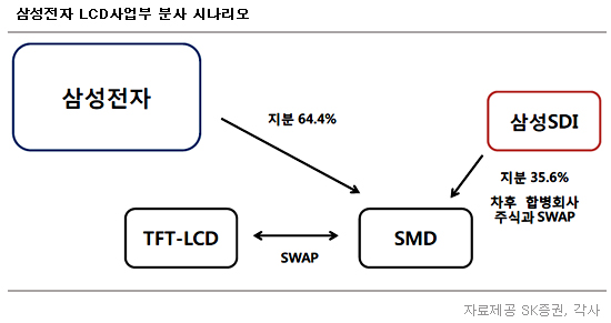 | SK증권은 15일 삼성전자가 LCD 사업부를 분사한 이후 SMD와 합병 할 경우 삼성전자와 삼성 SDI 지분에 대한 시나리오를 분석했다. 이에 따르면 삼성전자는 LCD 사업부 분사 이후 삼성 SDI의 SMD지분을 합병회사의 지분과 Swap 할 것으로 판단된다고 SK증권은 설명했다. | ||