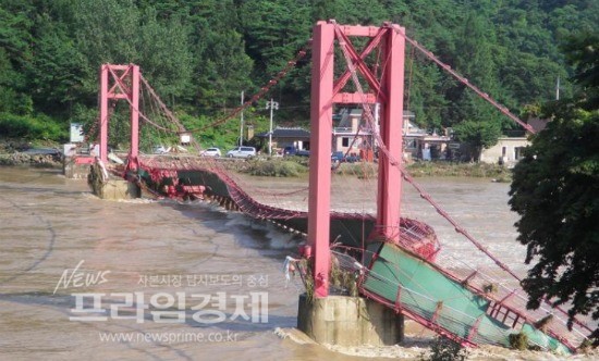 이 현수교는 지난 2010년 수해로 유실(두가현수교 사진위)돼 국비 46억원을 들여 지난 1월 완공됐으며, 길이 200m, 너비 3m 규모다.