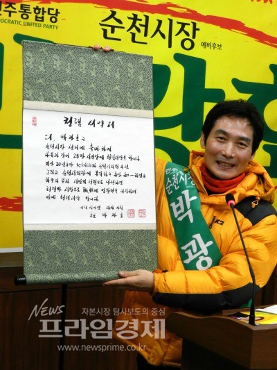 | 박광후 순천시장 예비후보(전 순천시의장)이 15일 출마 기자회견장에서 자신이 붓글씨로 새긴 '청렴서약서'를 들어보이고 있다. | ||