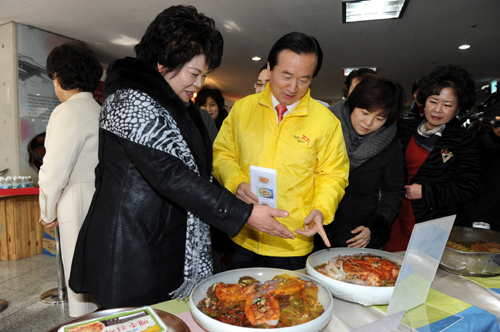 | 강운태 광주시장이 15일 광주김치타운 김치체험장에서 열린 ‘맞춤형 광주김치 전시 및 품평회’를 둘러보고 있다. | ||