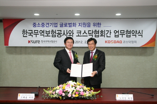 | 왼쪽부터 한국무역보험공사 조계륭 사장과 코스닥협회 노학영 회장이 협약식 후 기념촬영을 하고 있다. | ||