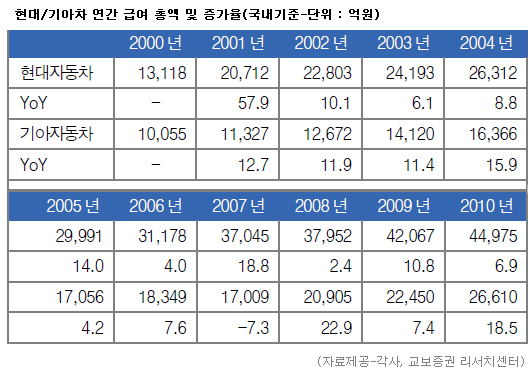 송 연구원은 “이번 영향으로 현대·기아차 주가가 하락하면 매도하기보다는 벨류에이션 매력 확대를 주목해 매수로 대응하는 전략이 유효하다”며 “현재 2012년 예상 EPS 기준으로 현대차와 기아차의 주가수익비율(P/E)은 각각 6.1배와 7.3배로 인건비 상승을 반영해도 다른 업종에 비해 저평가된 상황”이라고 말했다.