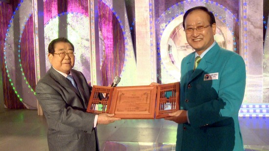 | 김충석 여수시장(사진 오른쪽)이 26일 '전국노래자랑' 사회자 송해씨에게 홍보대사 위촉패를 전달하고 있다. | ||